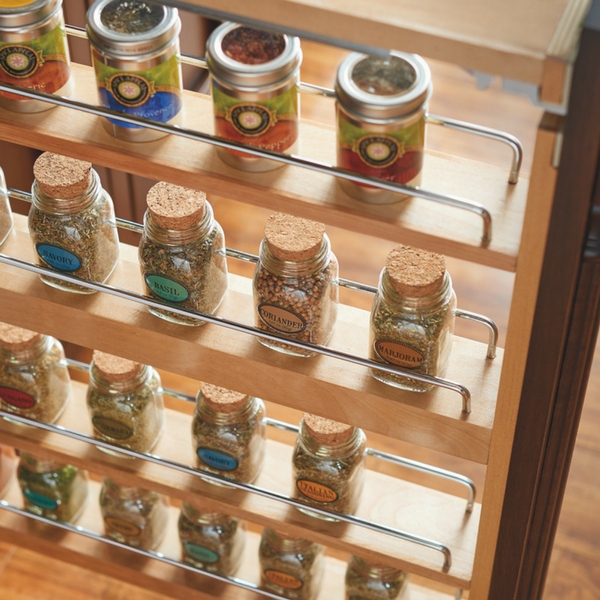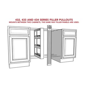 The Rev-A-Shelf 432-BFSC-3C Series mounts between two existing cabinets the same way filler panels are used. It is a completely assembled organizer with 25lb. weight rated full-extension slides. It features adjustable shelves with chrome railing. Easily add practicality to decorative fillers and gain extra storage space in the kitchen.