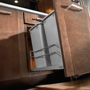 This particular unit gives the user great features like, soft close slides, door mounting kit and silver 35 quart cans. As an upgrade from the non-soft close ball-bearing guide and white wire pull-outs, the 53WC Series is a great option for a basic entry point to a soft close system. This is a straightforward product to get the job done in a moderately used kitchen or laundry room. It offers more style with the grey and champagne frame and matching waste container cans.